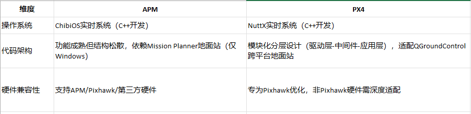 以下为APM与PX4开源飞控系统的深度对比分析,结合架构设计、应用场景及生态支持等维度,综合最新技术动态进行阐述: